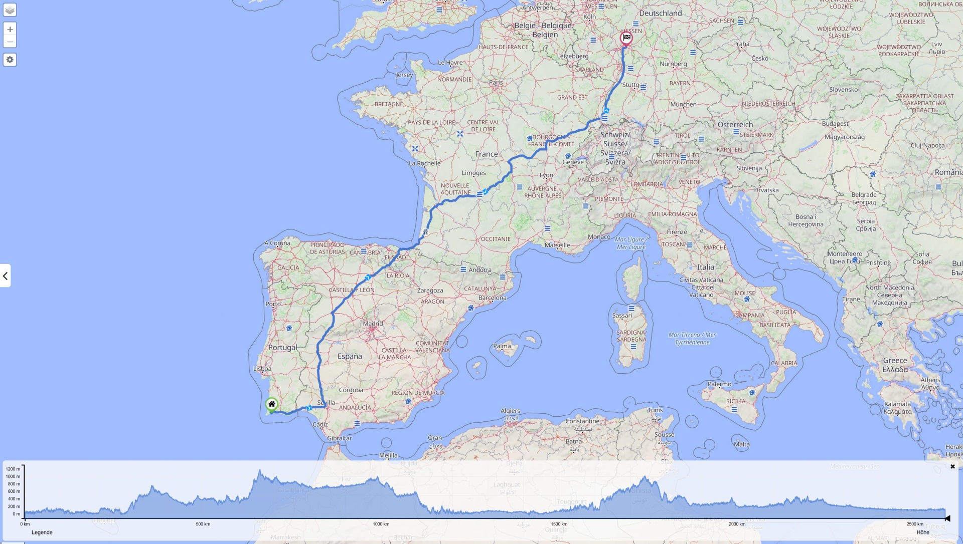 Da ich für Portugal keine wirklichen Ziele hatte und auch wenig Lust, mir spontan welche “auszudenken”, habe ich dann kurzum entschlossen, am kommenden Tag die Heimreise anzutreten. Die Strecke war laut Routenplaner knapp 2600km: