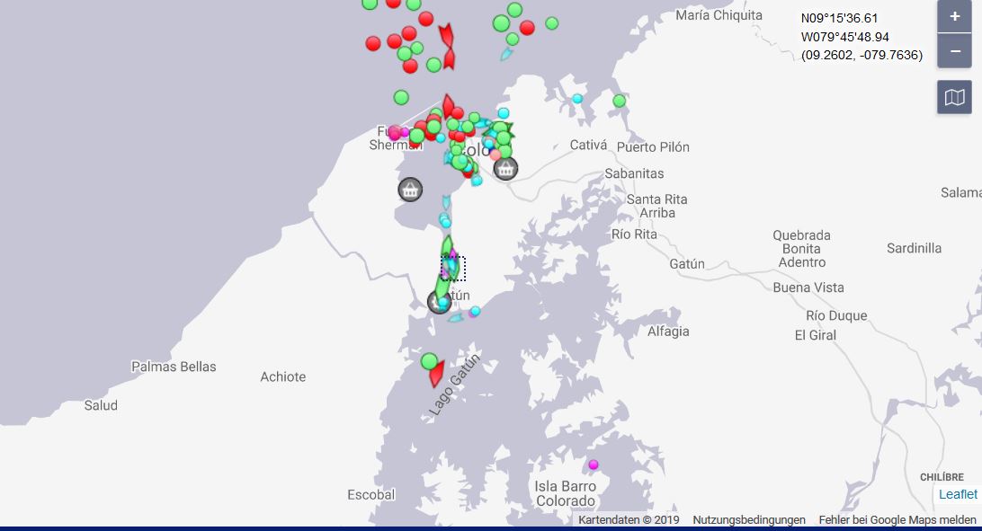 Jedenfalls ist der Panzer jetzt im Panama-Kanal. Ein paar Tage wurde vor dem Kanal geankert, jetzt geht es weiter (kleines gestricheltes Quadrat):