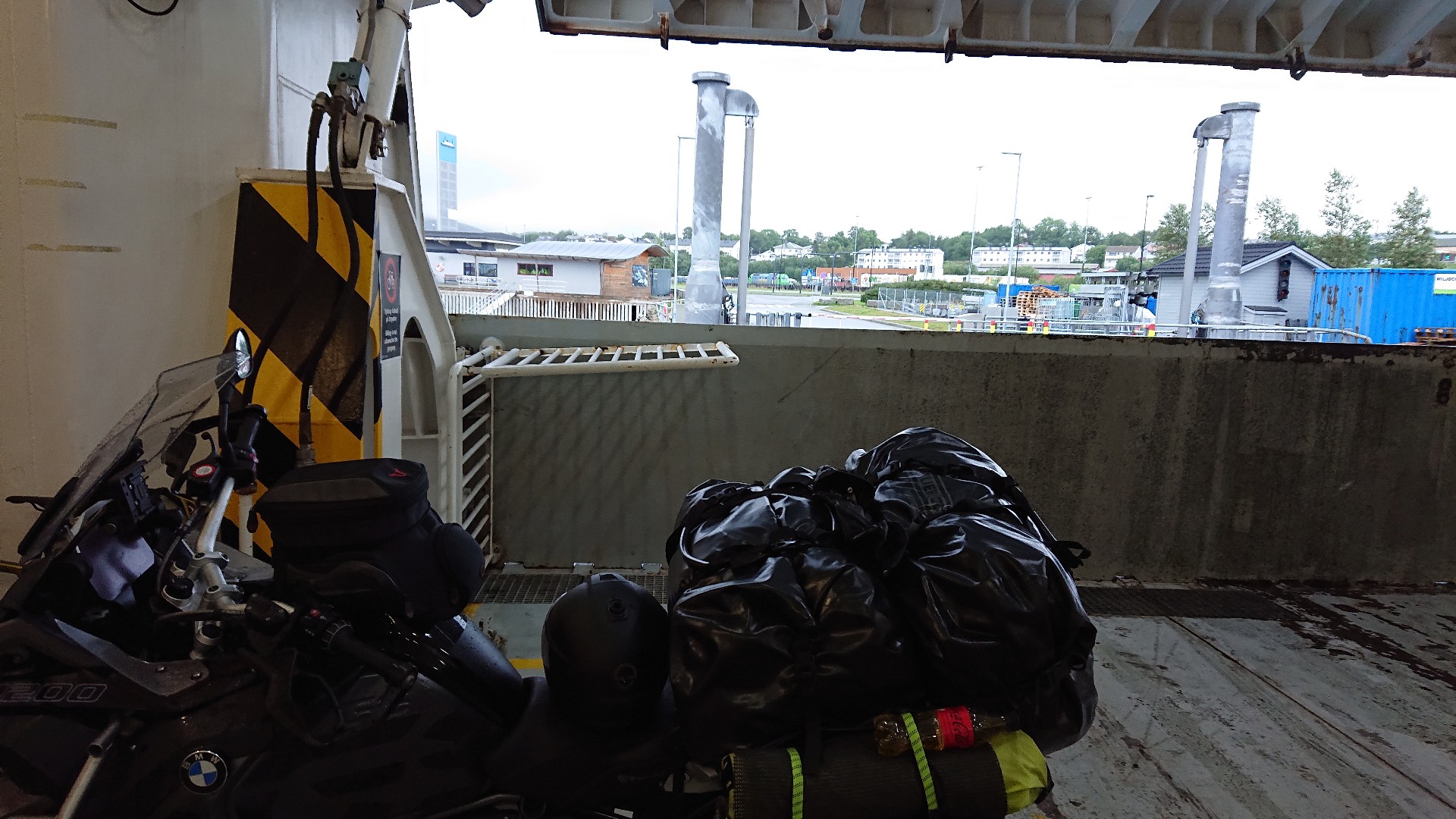 Zeitlich hat alles gut geklappt, sodass ich kurz vor 6 Uhr am Ableger war. Da ich kein Ticket reserviert hatte, musste ich auf die Spur ohne Reservierung. Wie es der Zufall (wieder einmal) wollte, ging die Spur ohne Reservierung um die Kurve bis Sicht auf eine Fähre (nicht zu sehen von den Reserviert-Spuren), die dort wohl gerade beladen wurde. Da mir einer von den Einweisern zuwinkte, bin ich doch mal direkt rangefahren. Und siehe da, die Fähre fährt ebenso nach Moskenes auf den Lofoten. Zack an Bord und Moped festgeschnürt und dann ging auch schon die Luke hoch. Vom Hotel bis zur Abfahrt waren es keine 10 Minuten … Auf dem Foto unten sieht man übrigens die ehemalige kleine Colaflasche, die auf der Seite mit dem gelben Spanngurt festgespannt ist. Dadrin transportiere ich mein Ersatzbenzin für den Benzin-Camping-Brenner. Der Einweiser hat etwas geäugt … er hat aber nichts gefragt, ich habe nichts gesagt 😉