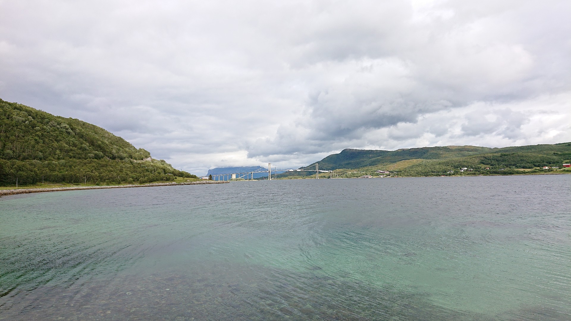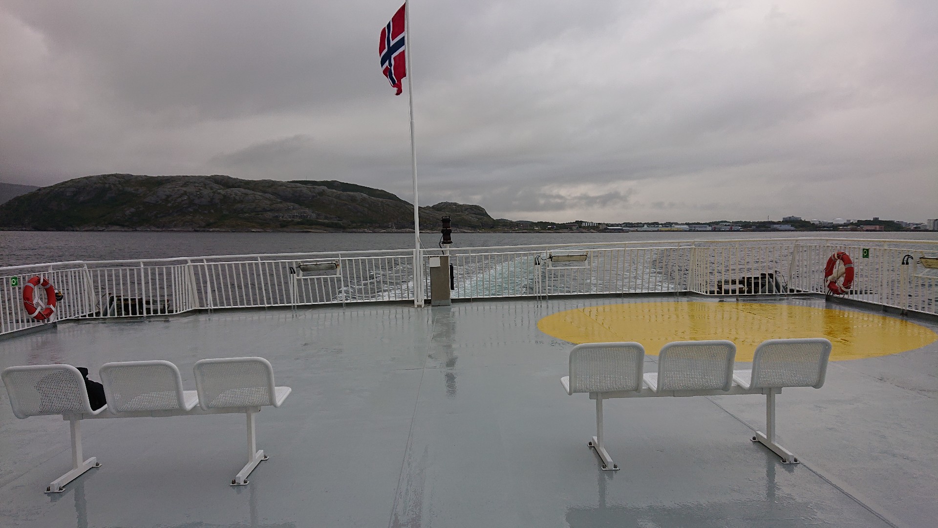 Und dann ging es schon raus aus dem Hafen. Das ist mir sowieso schon aufgefallen. Hier scheint beim Thema Fähren kein großes Theater gemacht zu werden. Autos drauf? Na dann schon mal Gas geben, Luke währenddessen schließen und ab geht’s. Im Hafenbereich gab es dann noch eine steile 180 Grad Kurve und mit recht guter Geschwindigkeit ging es Richtung Lofoten. Auf dem Foto unten sieht man die Kurvenschräglage ganz gut, die der Captain da an den Tag gelegt hat: