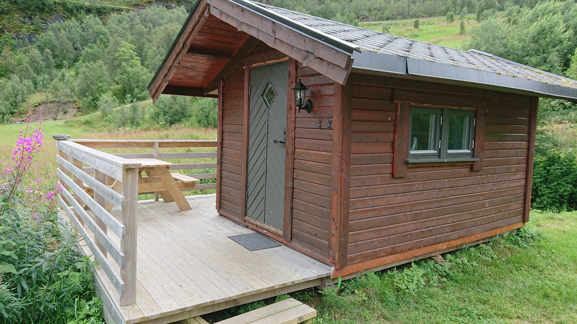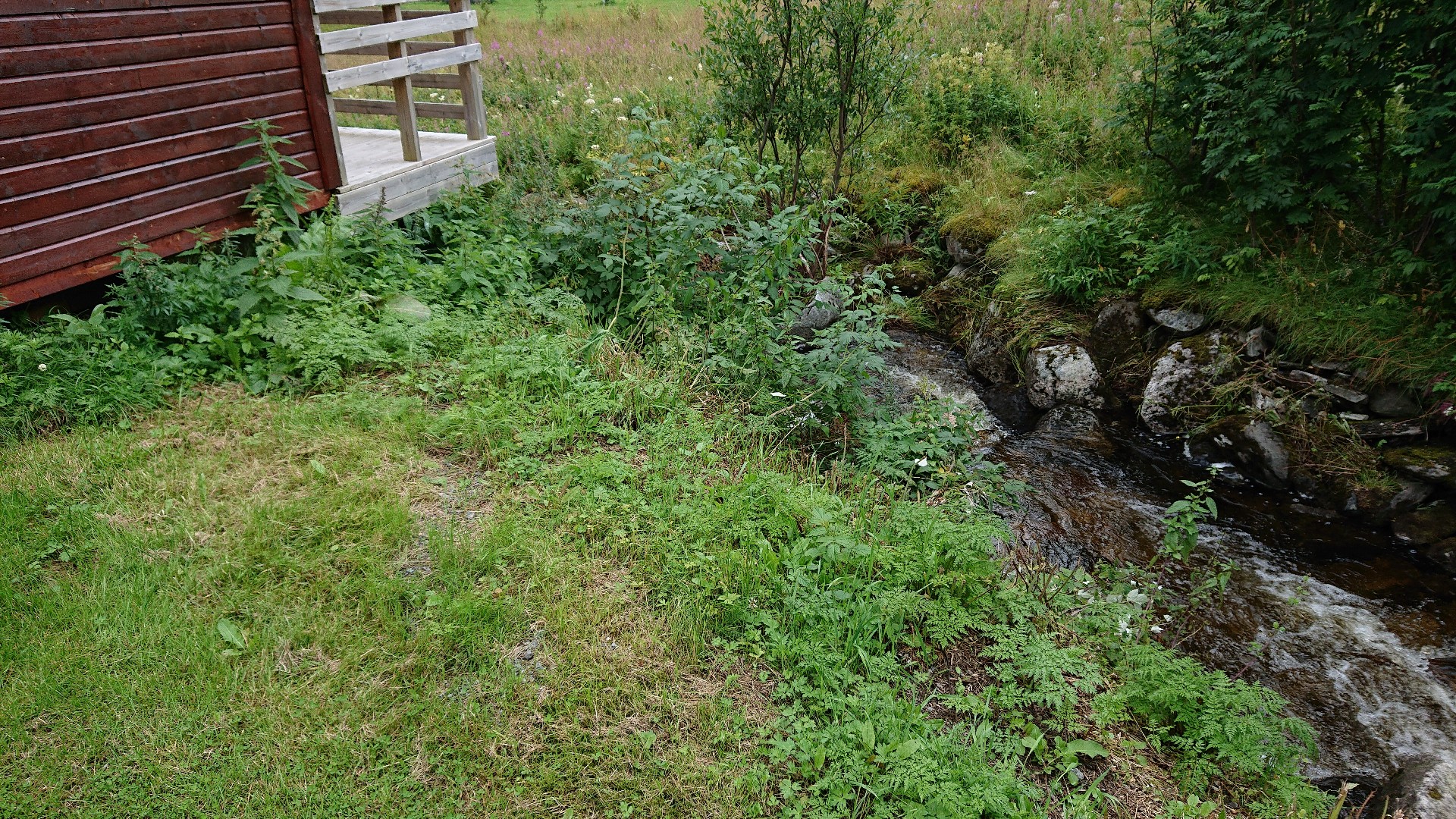 Der Bach, der halb um die Hütte herumführt, schaut nach nicht viel aus, macht aber jede Menge Lärm. Das Ambiente passt also.