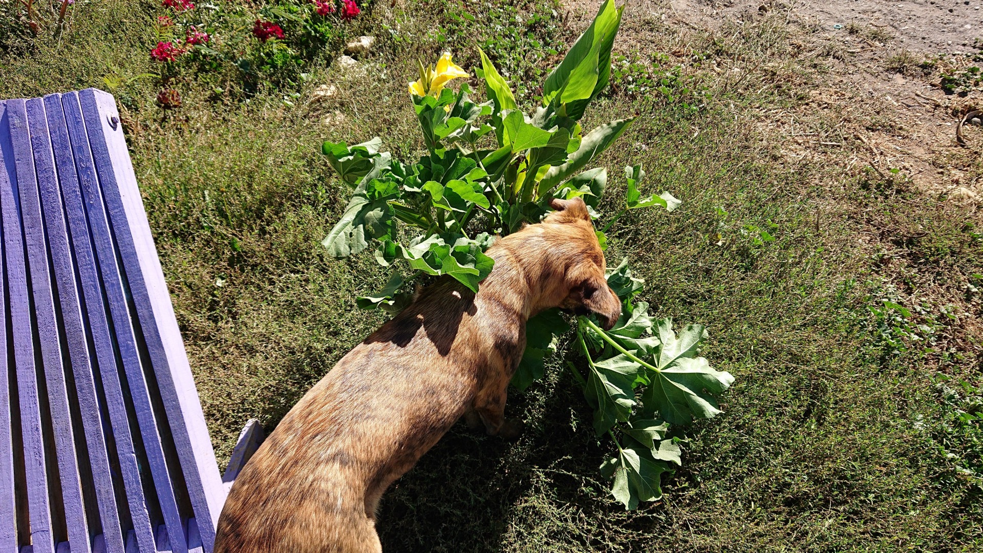 Und noch ein Foto von Luna von gestern, wie sie hier eine Pflanze auf dem Grundstück zerlegt hat. Das fand sie wohl so spannend, ich habe sie nicht da weg bekommen: