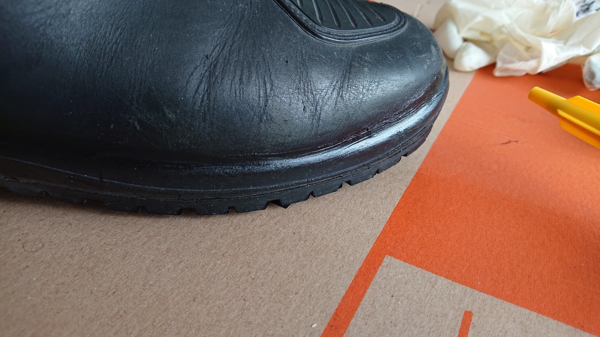 Die guten Daytona-Stiefel werden jetzt nach gut 60.000 km, 23 Ländern und über 12 Jahren vermutlich ihre Abschiedstour haben. Bereits in Skandinavien bei “leichtem Regen” ist mir nicht übersehbar aufgefallen, dass der rechte Stiefel nicht mehr so ganz dicht war. Ich hatte ihn auf der Tour an der Sohle geklebt. Die Sohle stand zwar nicht mehr ab, dicht war er aber dennoch nicht. Daher jetzt nochmal eine Ladung “Klebt und Dichtet”. Mal schauen, ob das funktioniert: