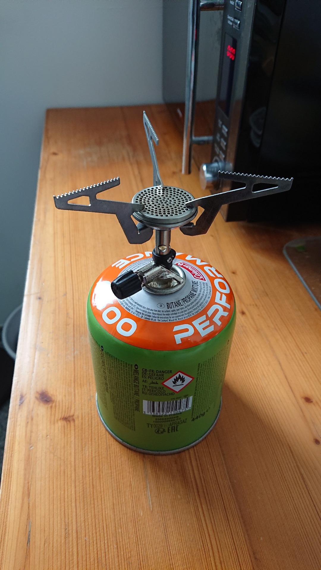 Wie beim Zelt gab es auch beim Camping-Kocher ein kleines Downsizing. Zudem bin ich wieder auf Gas umgestiegen. Für Skandinavien hatte ich meinen Gasbrenner auf Benzinbetrieb umgebaut. Das hat grundsätzlich auch funktioniert. War aber bei dem ganzen Ruß doch eine ziemlich unpraktische Sauerei. Zudem musste ich den Brenner schon während der Tour von Ruß befreien, da er den Betrieb einstellte. Entweder war ich für den Betrieb zu doof – oder das ist bei Benzinbetrieb halt einfach so. Laut Anleitung solle man ja auch Benzin in der Apotheke kaufen, weil es sauberer sei. Genau, ich stelle auf Benzinbetrieb um, um keine Gasflaschen mehr mitführen und unterwegs kaufen zu müssen, um mir Benzin in hoher Qualität in Apotheken zu kaufen. Das ergibt richtig viel Sinn. Wie dem auch sei, zurück zu Gas: