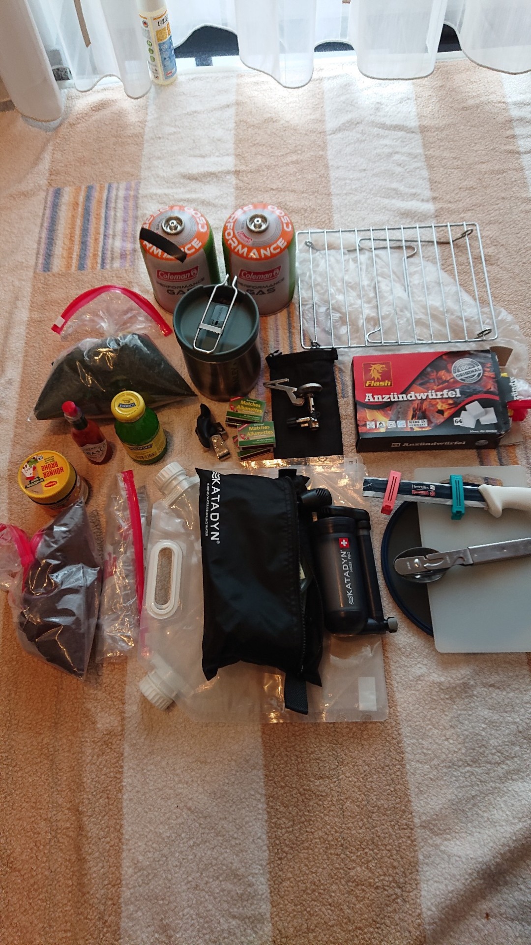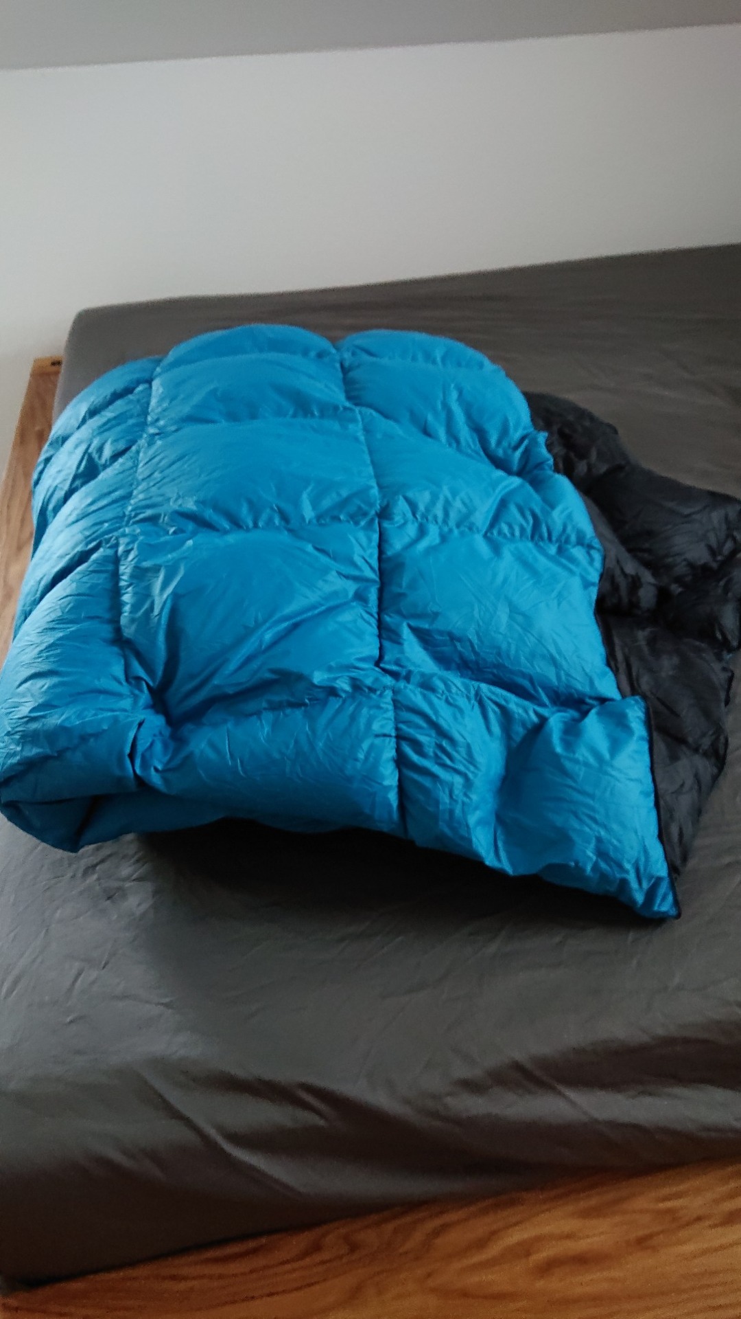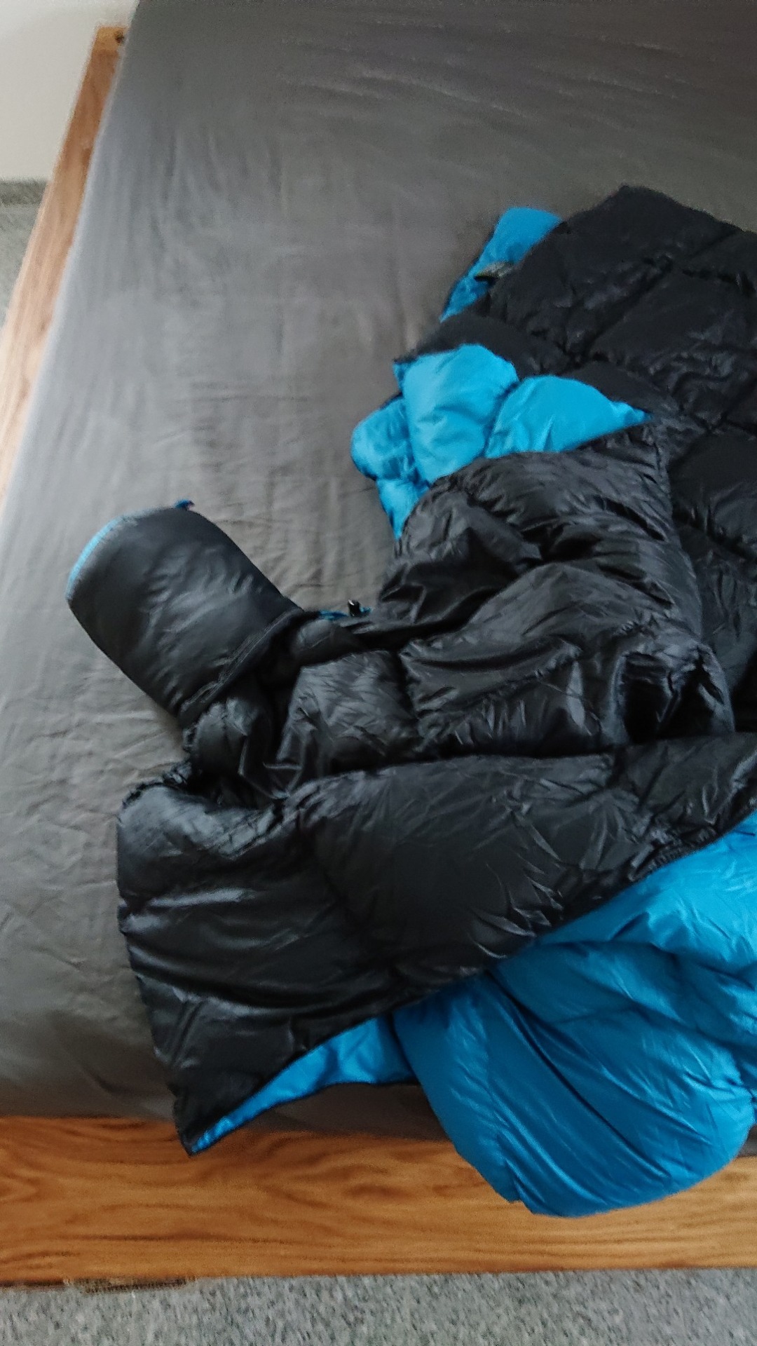 Ganz begeistert bin ich von der Daunendecke links unten im Bild. Seinerzeit in Chile wurde es nachts im Zelt dann doch deutlich einstellig in den Temperaturen, selbst mit Klamotte im Schlafsack wurde das irgendwann unangenehm schmerzhaft. Später habe ich mir einfach eine Decke gemopst, mit der das Problem gelöst war. So eine normale Decke ist natürlich platztechnisch komplett untauglich für eine Motorradtour. Daher die Daunendecke, die komprimiert weniger Platz weg nimmt, als der Hüttenschlafsack, den ich zuvor als Ergänzung dabei hatte – und der absolut nichts bringt, außer zu nerven.