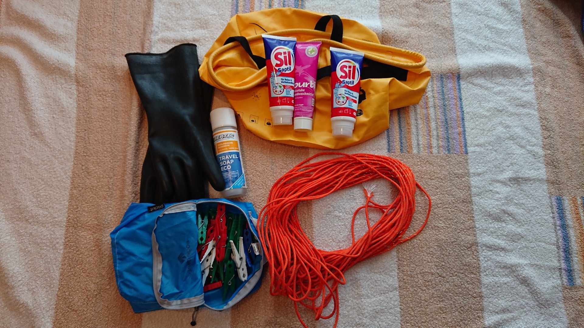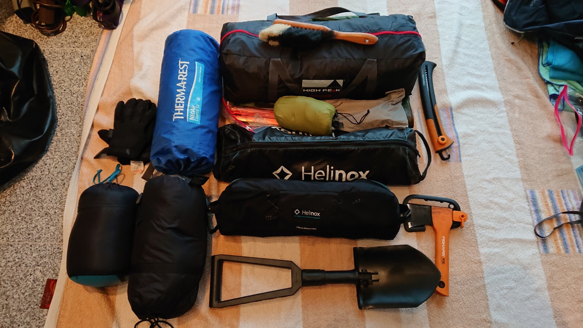 Ganz oben im Bild (unter dem Handfeger – der ist wichtig!) gab es mal ein neues, wieder kleineres Zelt. Zwar finde ich mein Atacama von Redverz platztechnisch super – ein riesiger Schlafraum und davor ein relativ großer Raum, in dem man auch bei schlechtem Wetter “wohnen” kann, zudem nahezu Standhöhe – aber es ist packmaßtechnisch einfach zu groß und dauert im Aufbau zu lange. Grundsätzlich möchte ich auch das Camping-Thema deutlich reduzieren. In Skandinavien musste ich wetterbedingt regelmäßig auf feste Behausungen ausweichen und ich habe festgestellt, dass ich auf dieses ganze Zeltaufbau-, Zeltabbau- und Sich-über-die-anderen-wie-Schweine-aufführenden-Campingplatz-Bewohner-ärgern-Theater keine Lust mehr habe. Ganz auf die Option verzichten wollte ich aber nicht. Vielleicht ergibt sich ja sogar die Möglichkeit, irgendwo in der Wüste wild zu campen – sofern mir da kein Skorpion in meinen Stiefel krabelt …