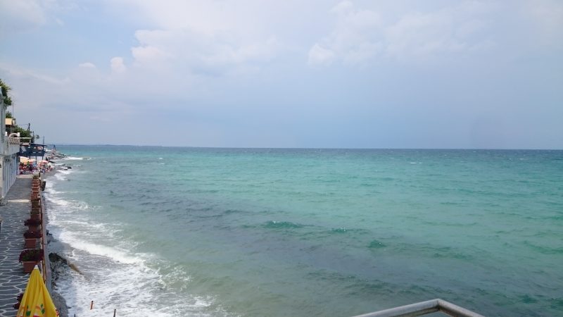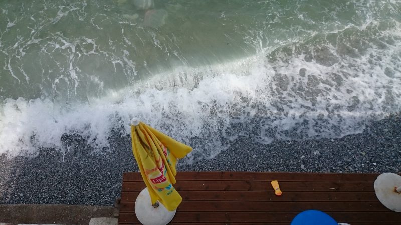 Das Meer war recht stuermig, sodass es mal zur Abwechslung kein glasklares Wasser gab. In der Folge hab ich mir doch direkt beim Wassergang den linken Fuß an den miesen Steinen aufgeschnitten. Aber er ist noch dran und wird wohl auch nicht abfallen.