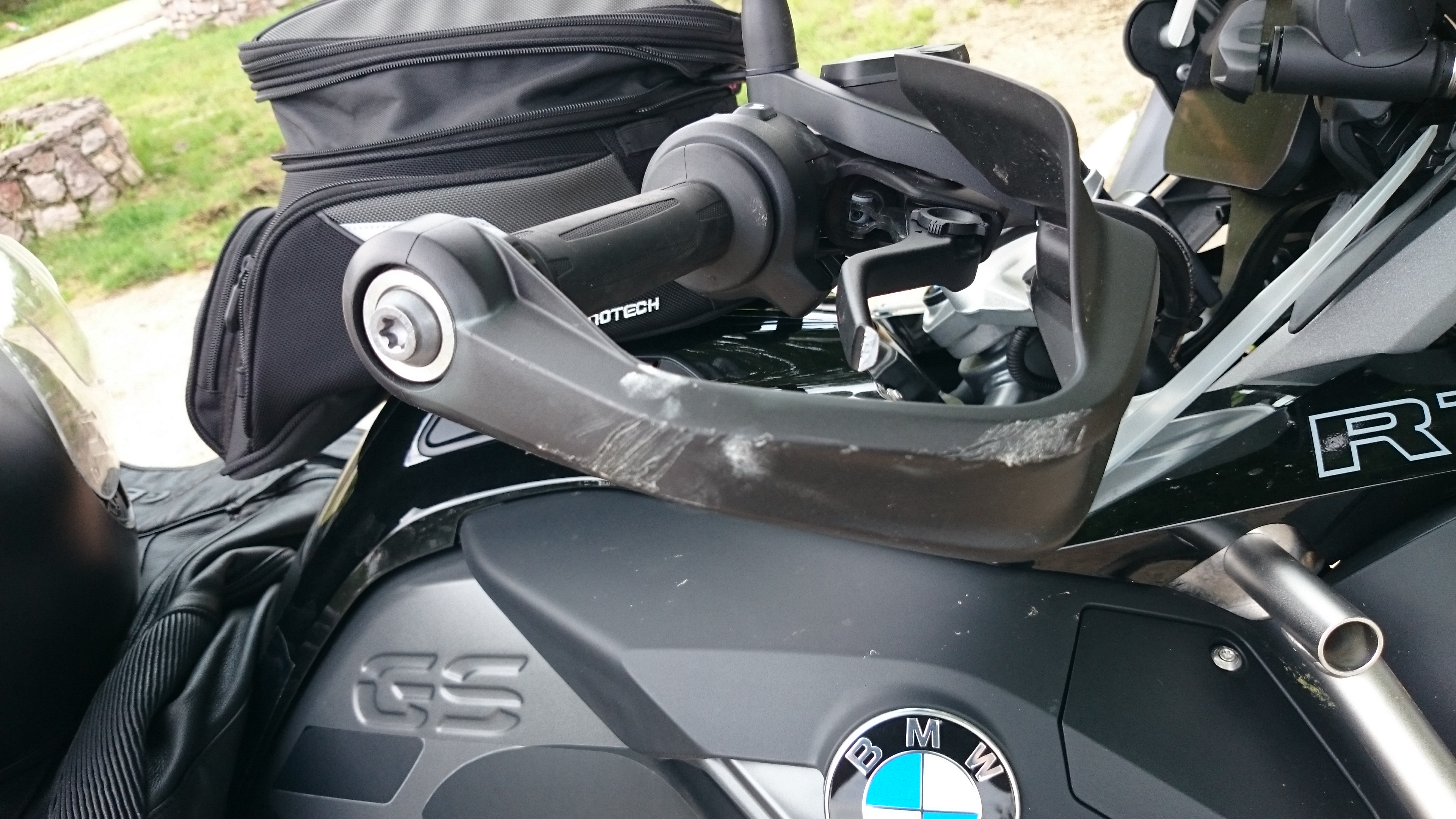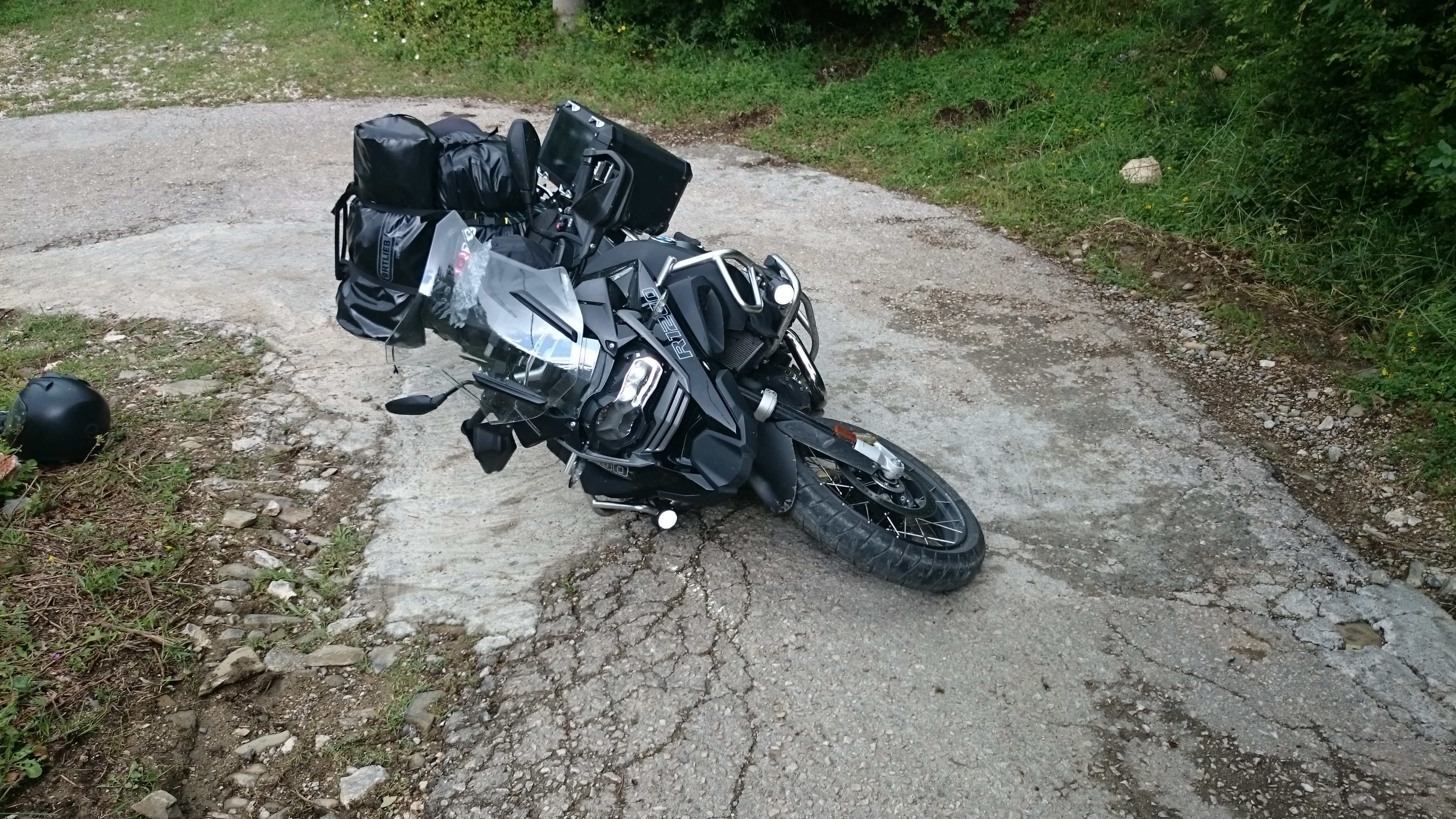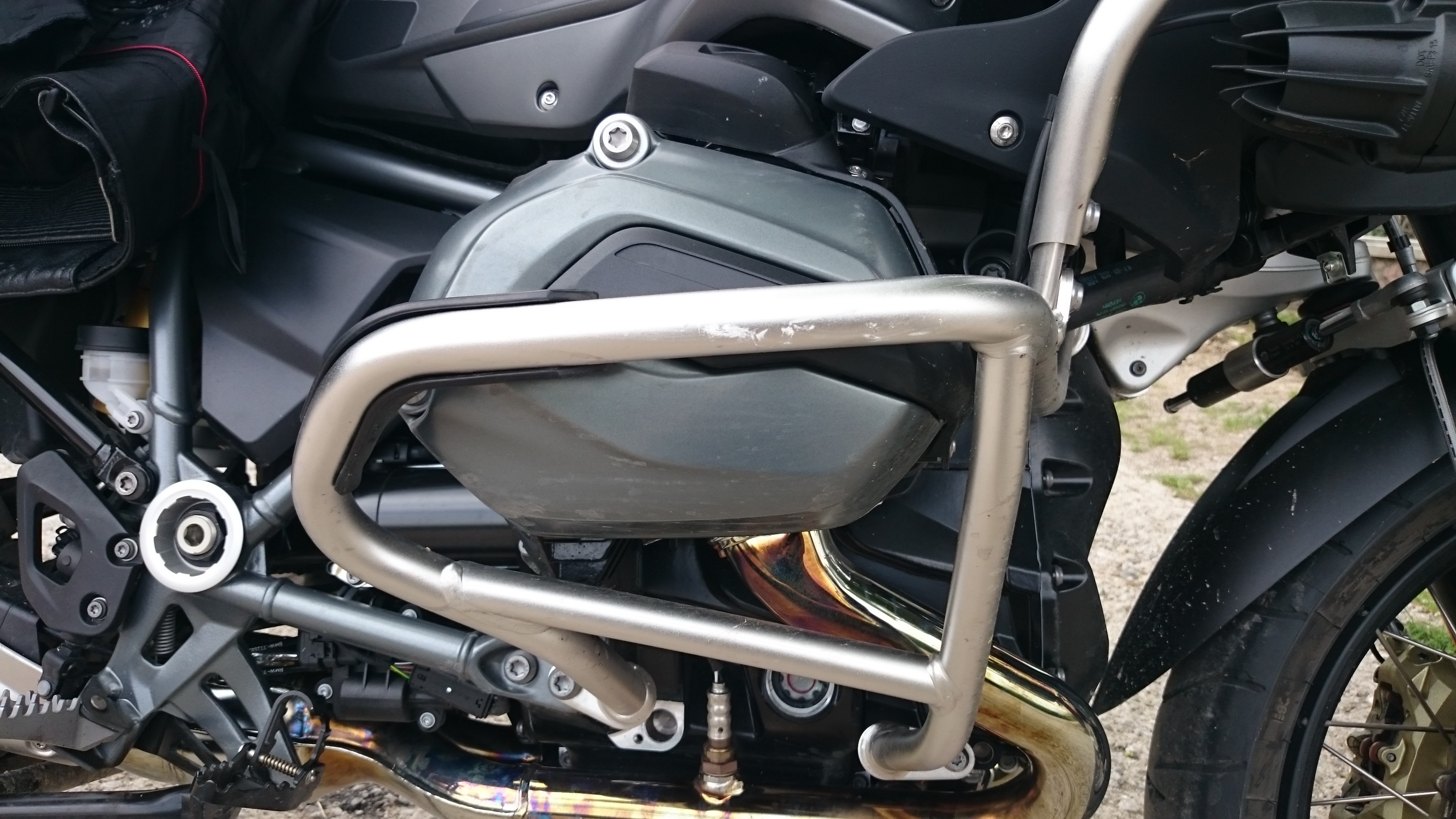 Einerseits ist es ärgerlich, dass ich mehr oder weniger blind aufs Navi vertraut habe, mein Fehler, weil ich die Straße von mir aus nicht gefahren wäre. Andererseits ist es irgendwie enttäuschend, dass die GS von einem schlichten Umfallen, wenn auch beim Anfahren, offensichtlich richtig Schaden genommen hat. Zumal die Bügel soweit erkennbar lediglich etwas zerkratzt sind.