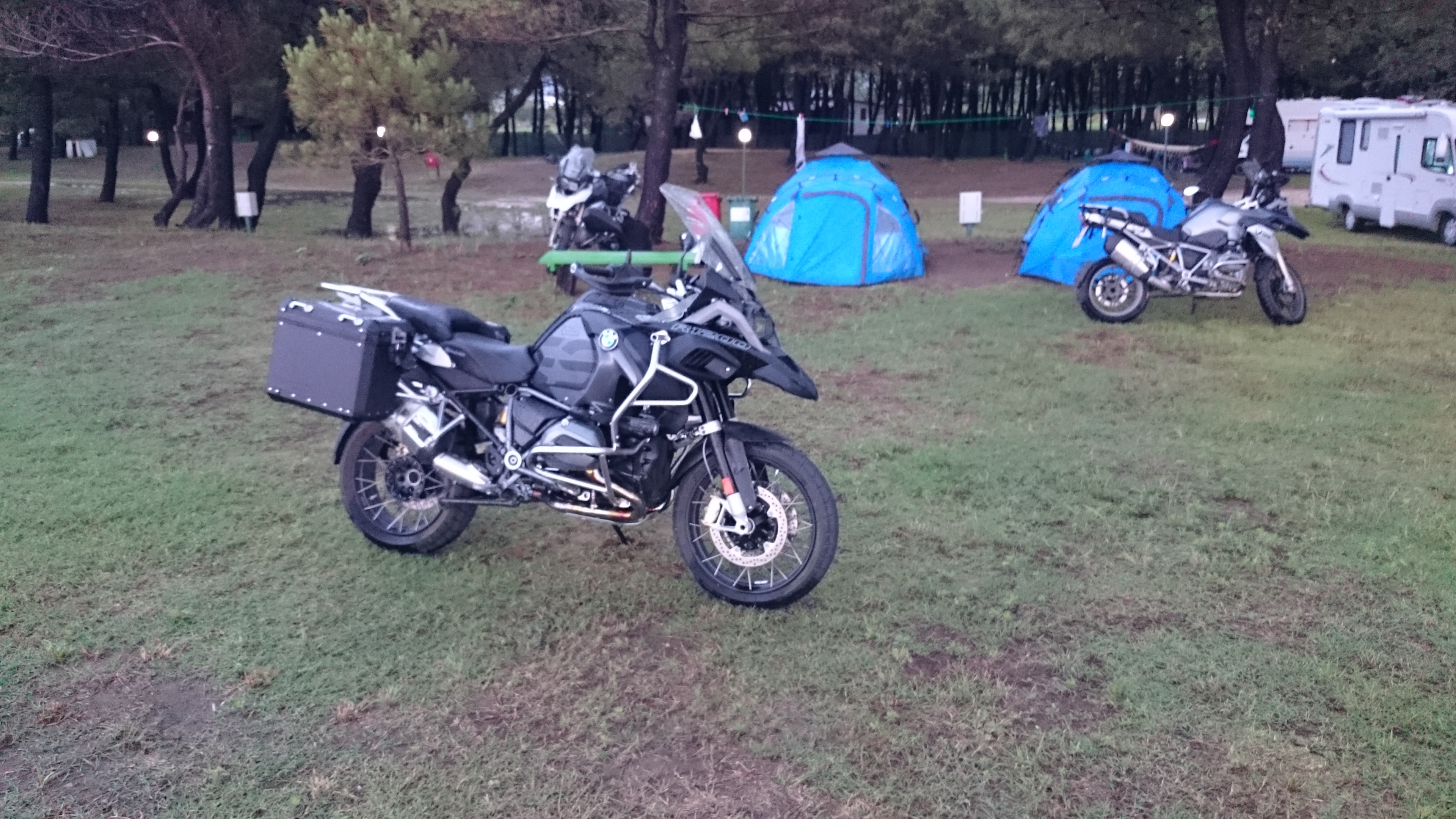 Momentan könnte das auch vom Feeling her Nordsee sein, deutlich Kühler, laute Brandung. Wobei der Geruch an der Nordsee doch nochmal anders ist. Insgesamt ist das Wechselspiel bisher aber beeindruckend. Sowohl der Wechsel Gebirge und Küste als auch von brennender Sonne (gestern Nachmittag hab ich mir dann mal ein Plätzchen irgendwo unter Bäumen gesucht…) und einer Wetterlage wie jetzt.Und letztlich, selbst wenn es mal ordentlich nass wird, in der Regel trocknet das ziemlich zügig durch Wind und steigender Temperatur. Mein Panzer hat gestern noch etwas Gesellschaft bekommen, Frank und Markus aus Schwerin, jeweils mit einer GS unterwegs: