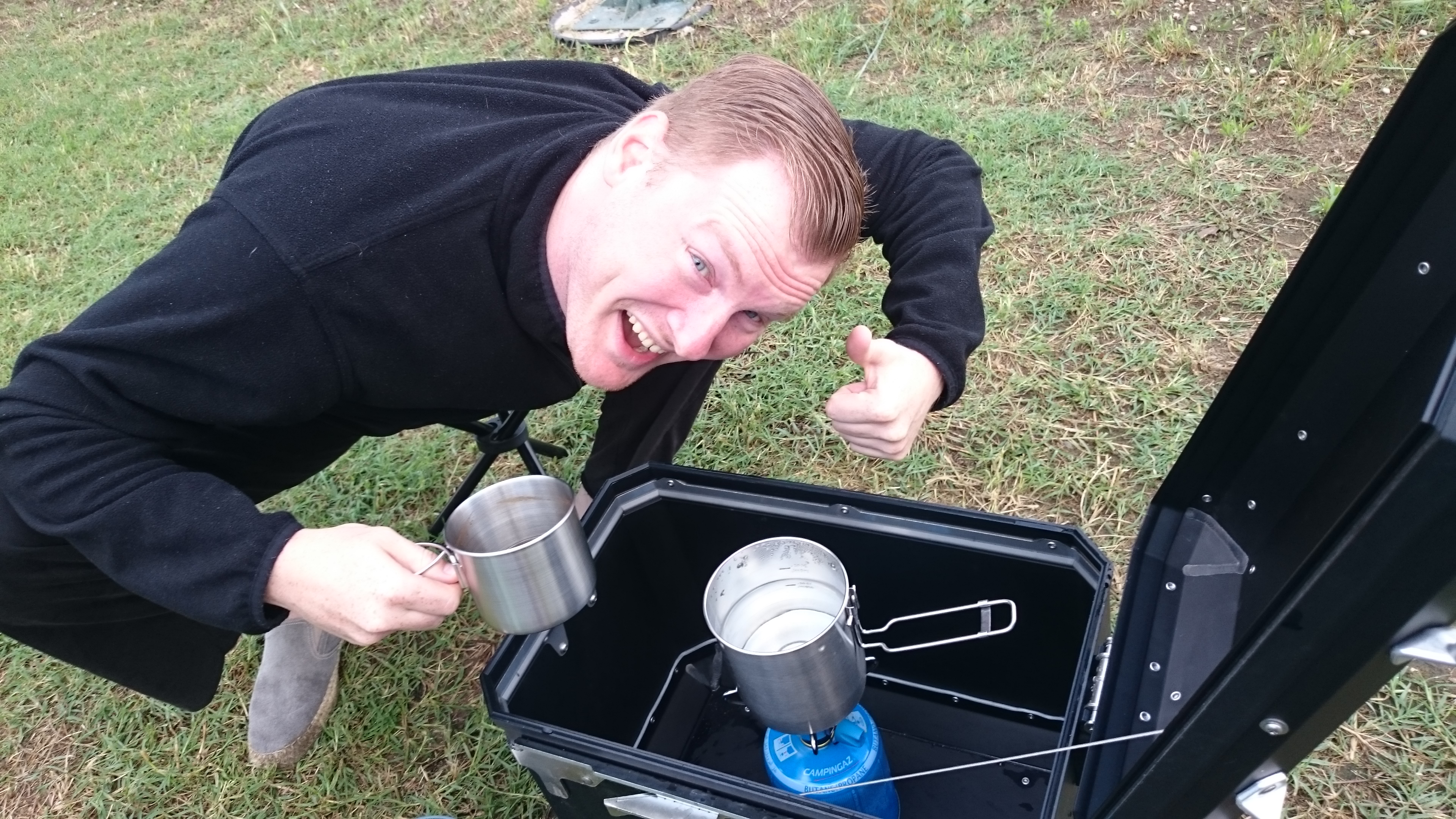 Markus (Vorsicht, Bulle) aus dem Norden ist begeistert von meinem Kochkoffer (wg Wind):