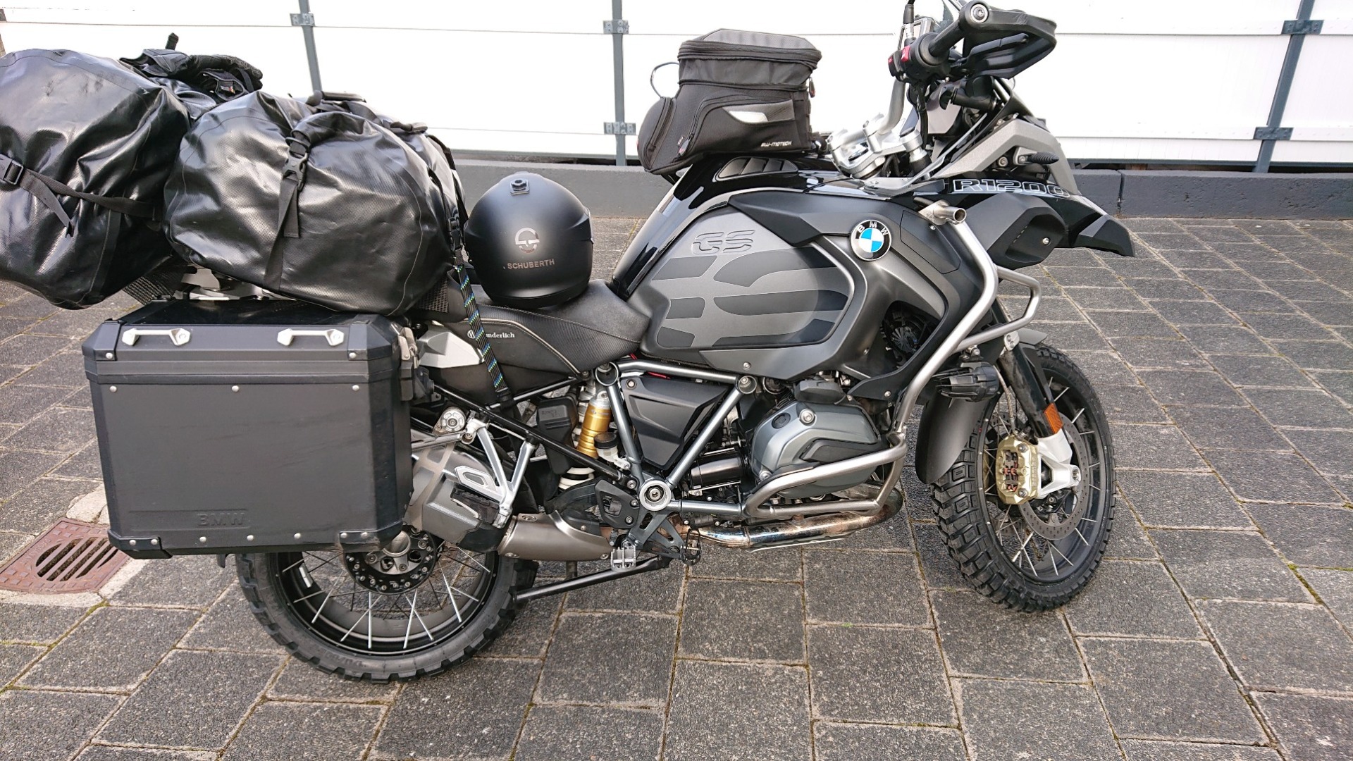 Wieder einmal muss ich sagen: Das sieht packtechnisch auf dem Foto schlimmer aus, als es ist. In der Tasche links sind letztlich alle Dinge, die ich für ein potentielles Camping brauchen würde. Im Vergleich zu den vorherigen Touren sind die Taschen auf den Alu-Koffern verschwunden – da hab ich passend den Rotstift angesetzt.
