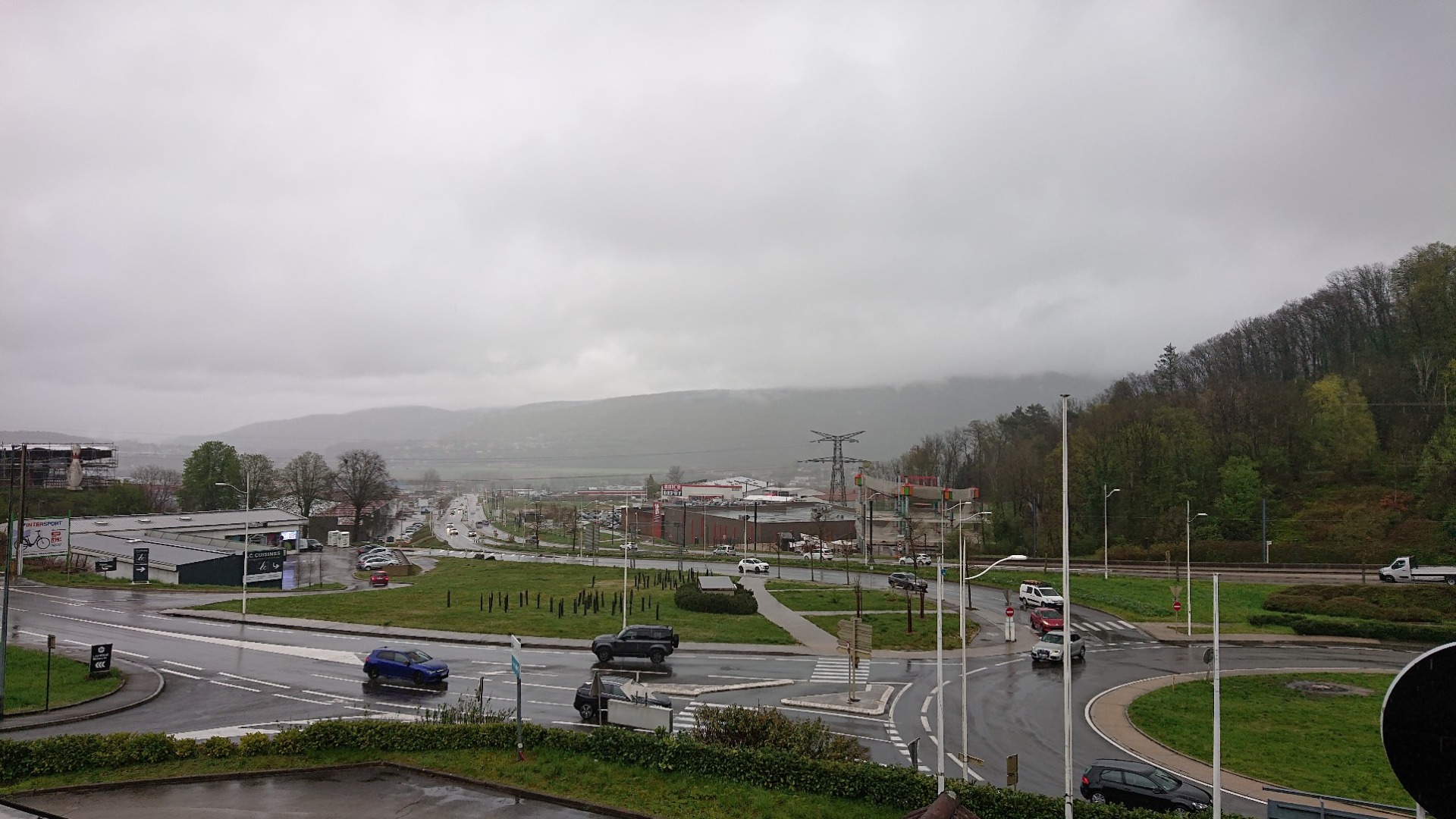 Nachdem ich kurz in Angriff nehmen wollte, einfach bis 16 Uhr durchzufahren und zu schauen, wo auf dem Weg ich dann ankomme, fing das Wasser dann so langsam an, in die Ärmel zu laufen. Das war dann doch das Zeichen, mir eine Unterkunft zu suchen. Und so ist es letztlich genau Besancon geworden, im wunderschönen Brit Hotel mit Blick auf einen Kreise und sonstigen Krempel. Wetter: Grau in grau.