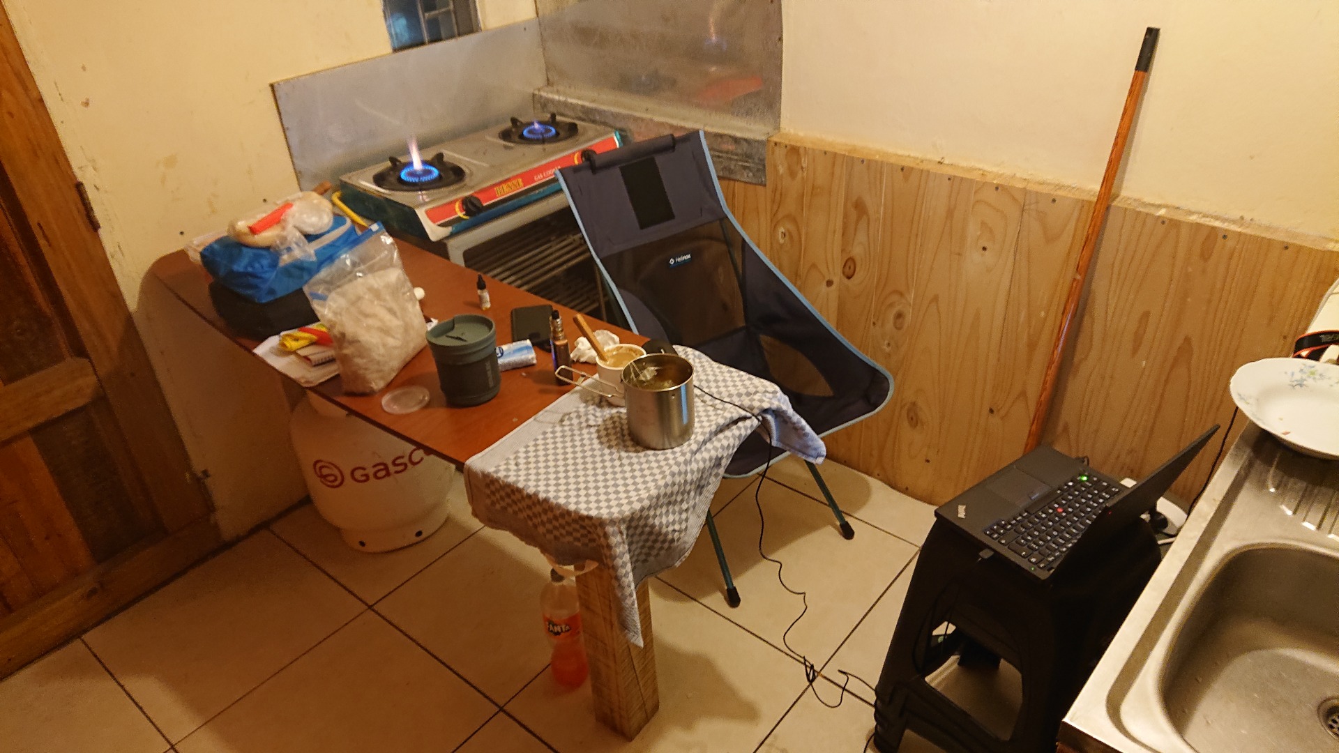 Zurück zur kalten Nacht: Da meine Suite wie gesagt doch recht kalt wurde, habe ich mal meine Gasheizung angeschmissen und mich dann in der Küche für den Abend eingerichtet. Das gleiche Szenario dann am Morgen zum Aufwärmen: