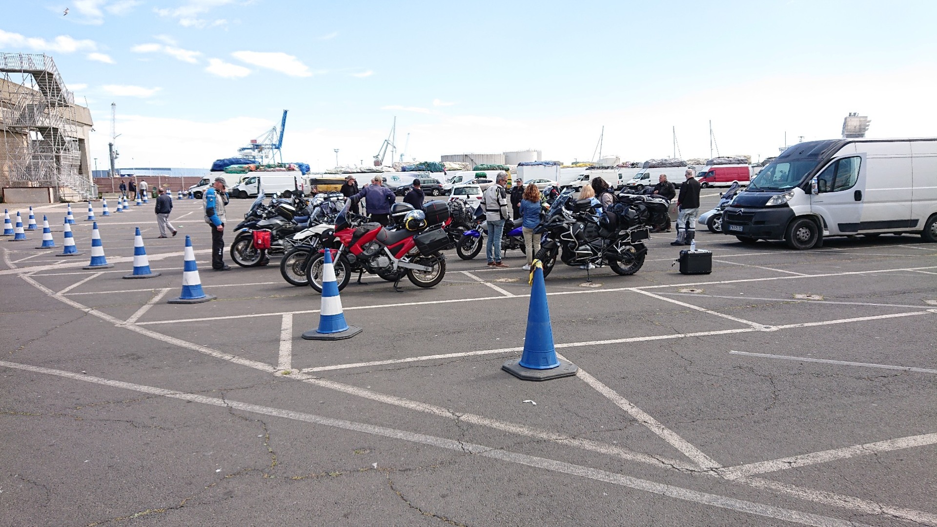 Einen weiteren Spezialisten gab es mit einem alten Wohnmobil (vermute ebenso Import-Export-Thema). Einige Zeit vorher war er auf der Suche nach Werkzeug, weil der Karren nicht ansprang. Die letzten 300 km hat er wohl nach einer Starthilfe zurück gelegt, ohne den Wagen auszustellen. Jetzt ging er wieder nicht mehr an. Halbwegs vernünftig vorbereitet bekam er Werkzeug von mir und hat an der Batterie rumgeschraubt. Werkzeug hat funktioniert, Auto aber immer noch nicht. Er hat sich dann jemanden organisiert, der ihm zum Boarding wieder Starthilfe gibt. Das hat gut eine viertel Stunde gedauert – aus irgendeinem Grund hielt er es für sinnvoll, den Wagen mit eingelegtem Gang bzw. ohne Kupplung zu treten starten zu wollen, Satz nach vorne und beinahe in die Motorräder vor ihm rein. Da waren plötzlich alle wieder wach! Schlussendlich hat es aber geklappt, hier noch eine kurze Impression, nachdem die Operation erfolgreich abgeschlossen wurde und alles bester Laune war (Wohnmobil rechts, links der Franzosenbulli als Starthilfe, dabei der rest des Pulks, der – wie das häufig so ist – mit ganz vielen fachmännischen Ratschlägen unterstützt hat):
