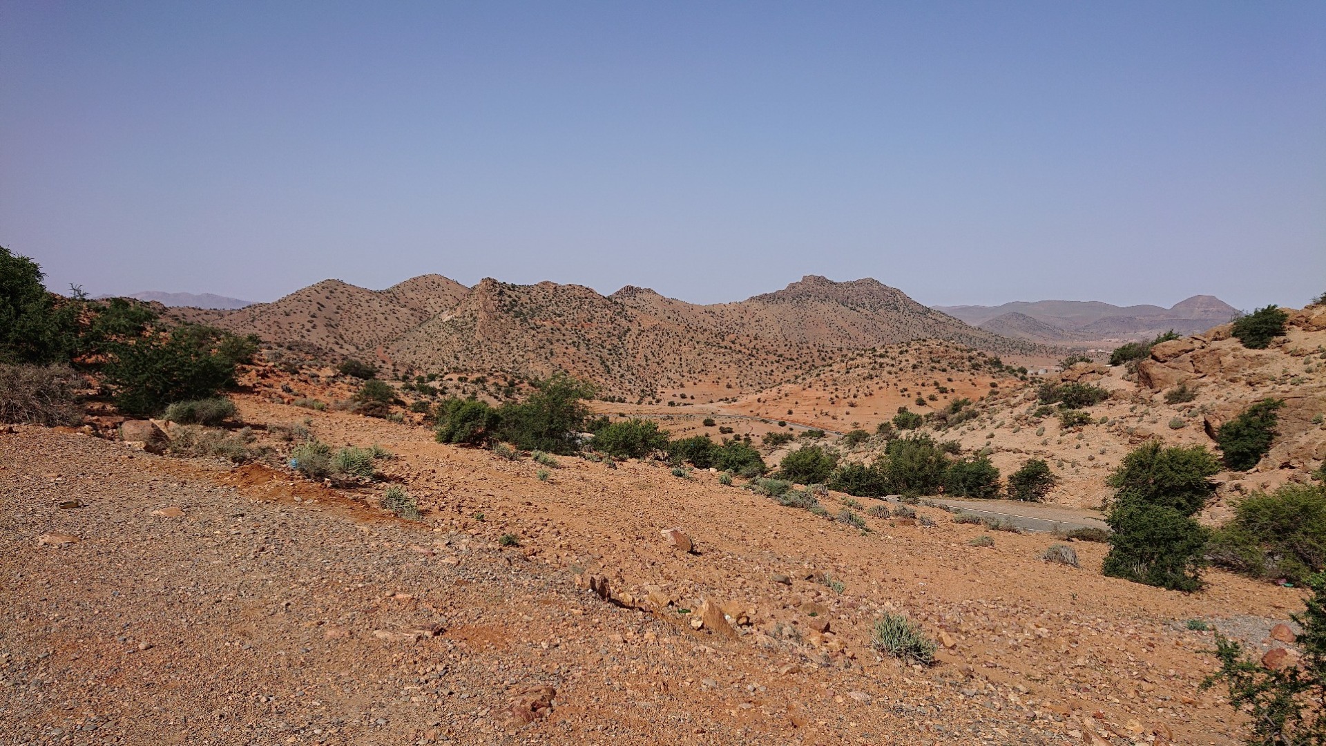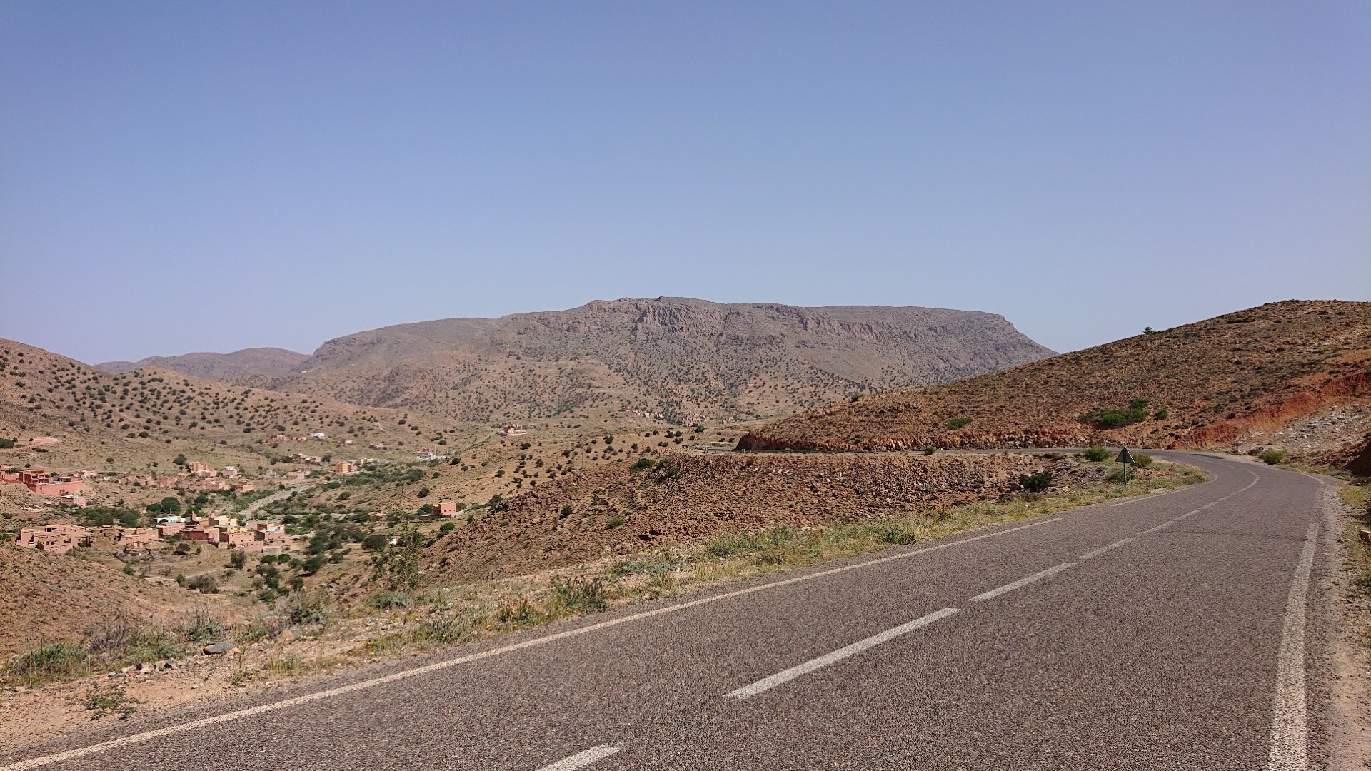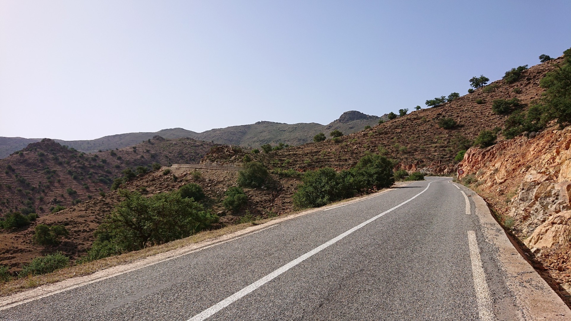 Der Nebel hielt sich dann auch gute 30 km nach Süden. Aber der Abbiegung Richtung Anti-Atlas wurde es dann deutlich netter. Wie immer Richtung Landesinnere alles sehr trocken, bis dann irgendwo eine Oase / ein Fluss auftaucht, dann gibt es wieder Grün. Insgesamt eine sehr schöne Strecke. Man schraubte sich in die Berge hoch und da ging es dann immer entlang der jeweiligen Bergführung. Tunnel gibt es hier nicht. Dabei muss man auch immer etwas aufpassen und nicht “auf Sicht” der nächsten Biegung fahren und dabei meinen, die kommende Biegung antizipieren zu können. Da geht es nämlich gerne mal 90 bis 180 Grad um die andere Ecke, bis man zu der Biegung kommt, die man bereits gesehen hat.