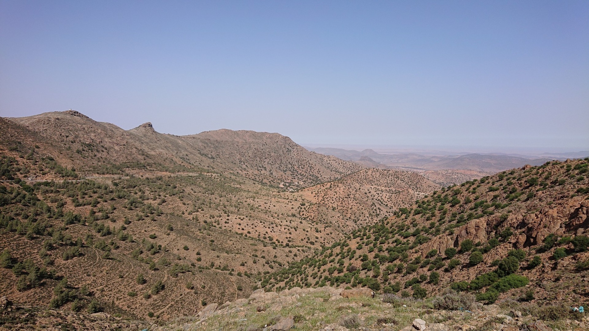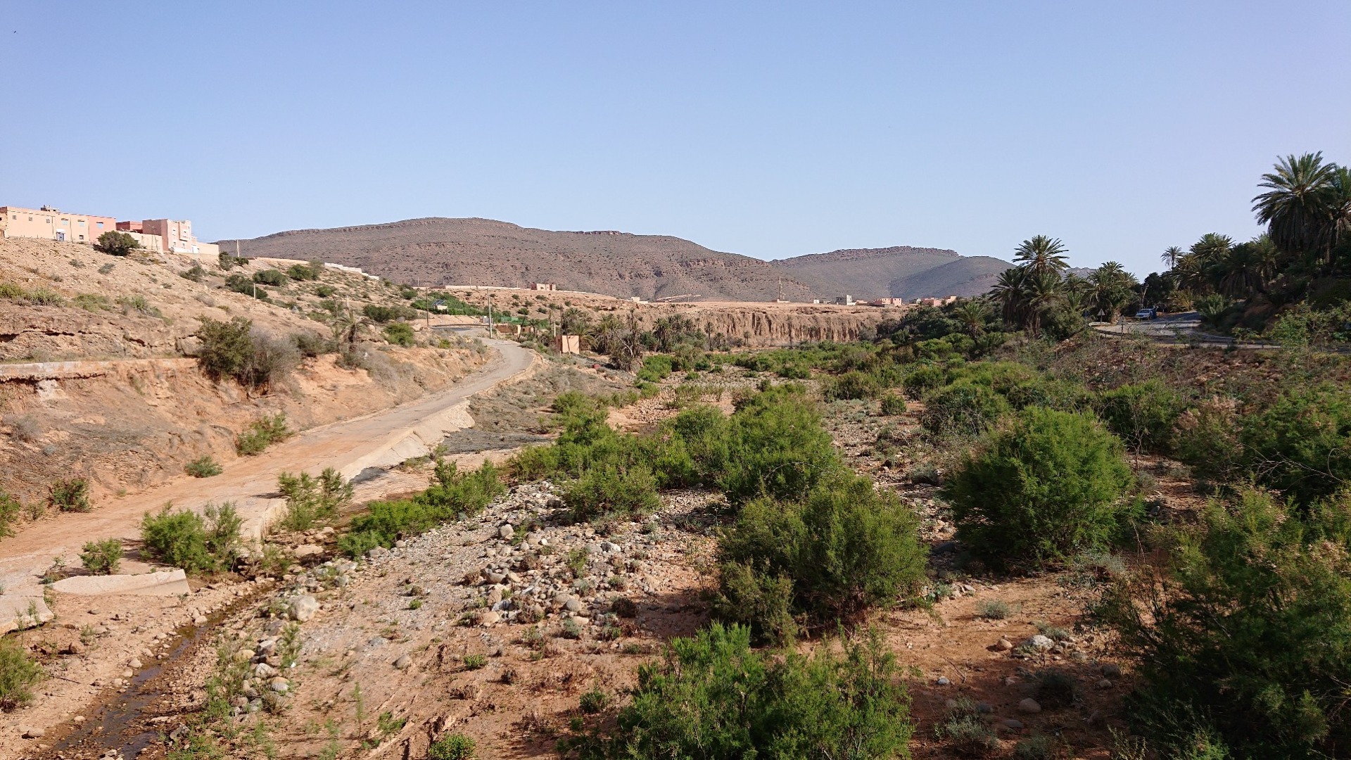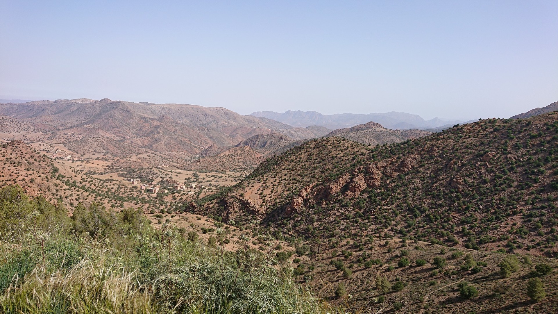 Der Nebel hielt sich dann auch gute 30 km nach Süden. Aber der Abbiegung Richtung Anti-Atlas wurde es dann deutlich netter. Wie immer Richtung Landesinnere alles sehr trocken, bis dann irgendwo eine Oase / ein Fluss auftaucht, dann gibt es wieder Grün. Insgesamt eine sehr schöne Strecke. Man schraubte sich in die Berge hoch und da ging es dann immer entlang der jeweiligen Bergführung. Tunnel gibt es hier nicht. Dabei muss man auch immer etwas aufpassen und nicht “auf Sicht” der nächsten Biegung fahren und dabei meinen, die kommende Biegung antizipieren zu können. Da geht es nämlich gerne mal 90 bis 180 Grad um die andere Ecke, bis man zu der Biegung kommt, die man bereits gesehen hat.