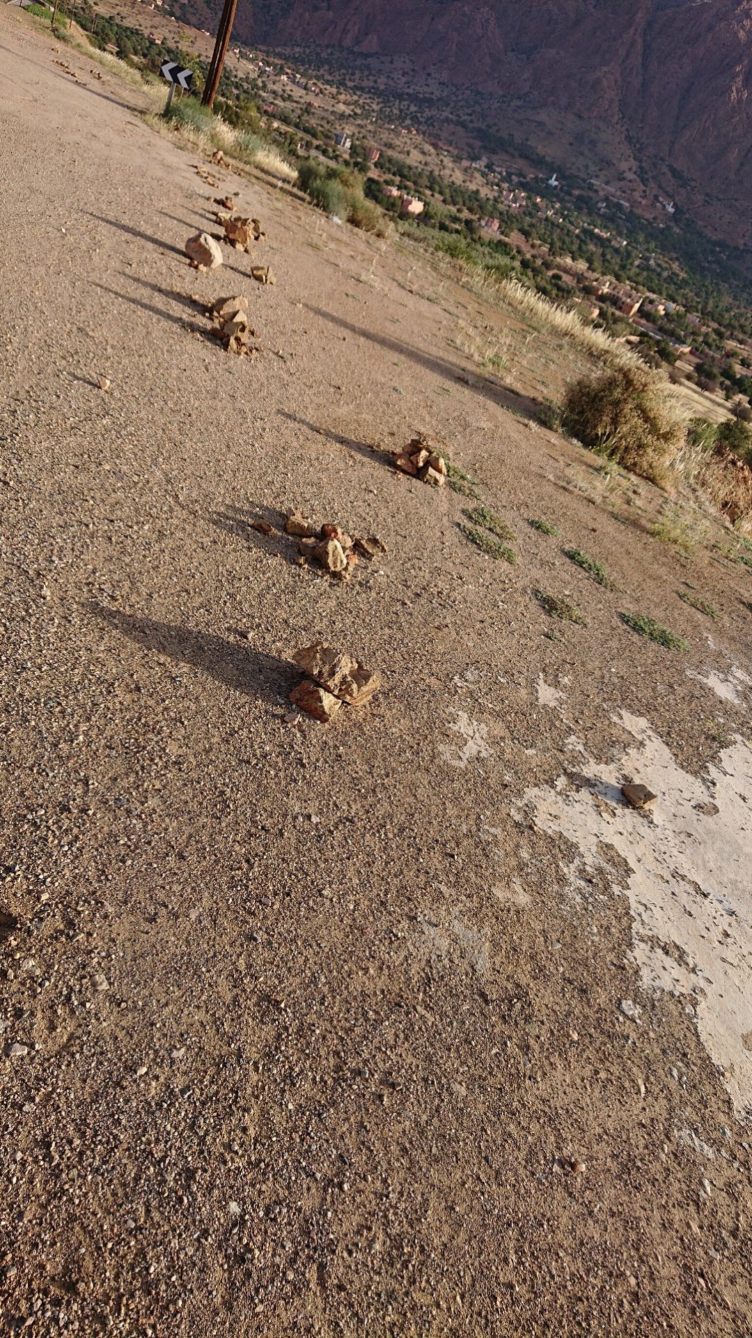 Straßenränder, aber auch Schlaglöcher und andere Stellen, über die man nicht fahren sollte – weil man sich das Auto kaputt macht (Schlagloch) oder weil man sich das Auto und sich selbst kaputt macht (steiler Abhang in die Tiefe) – sind häufig mit ein paar gestapelten Steinen markiert.