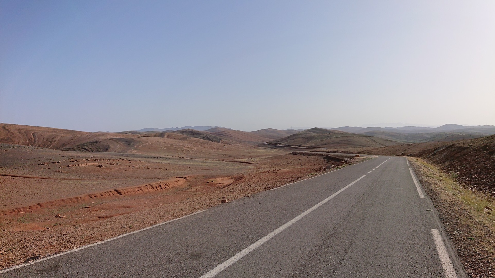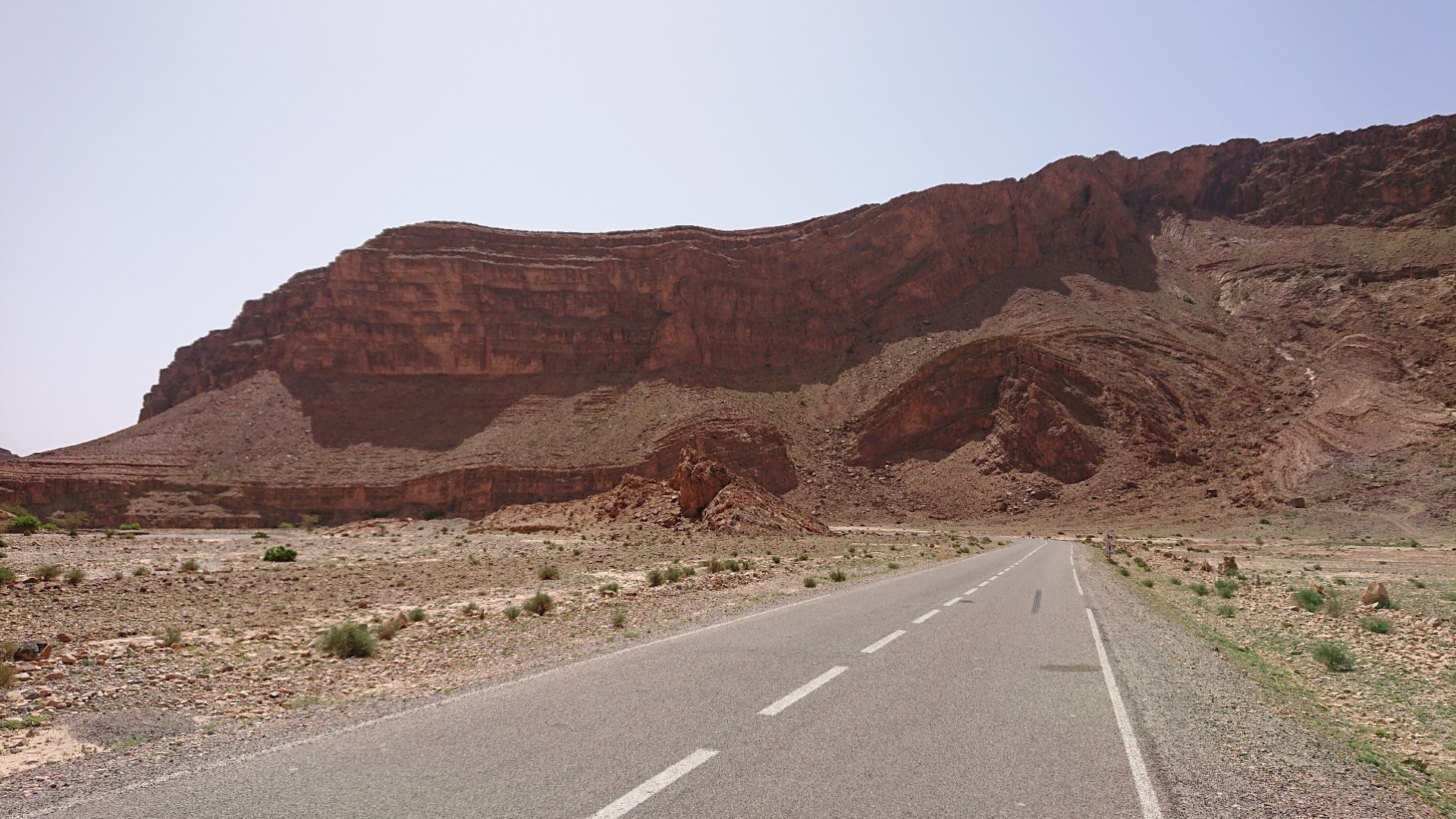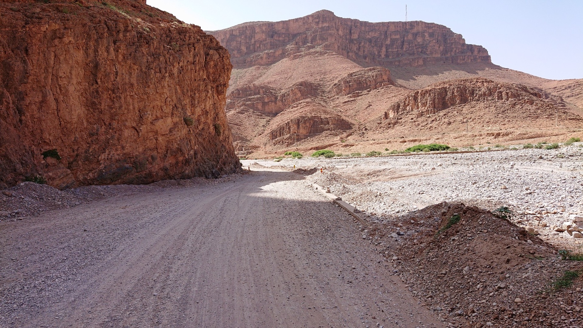 Die erste Strecke meiner heutigen Tour ging wie gesagt bis Igherm, oben auf der Karte quasi die “Spitze” der Route. Ab da dann wieder querfeldein bis runter nach Tata. Das Stück war eigentlich noch etwas netter, führte enger hier und da mal durch Schluchten und auch an einem Fluss bzw. Flussbett vorbei, das stellenweise riesig war. Wenn es mal regnet, muss es da aber so richtig zur Sache gehen. Unten auf den zwei Fotos sieht man rechts das trockene Flussbett, auf dem zweiten Foto auch eine Stelle, die offensichtlich weggeschwemmt worden ist. Solche Stellen gab es immer mal wieder, inklusive weggebrochener Straße. Ebenso aber auch immer mal wieder Stellen, die dann durch das Flussbett führen. Wenn es richtig Regen gab oder gibt, wird hier sicherlich nichts mehr gehen.