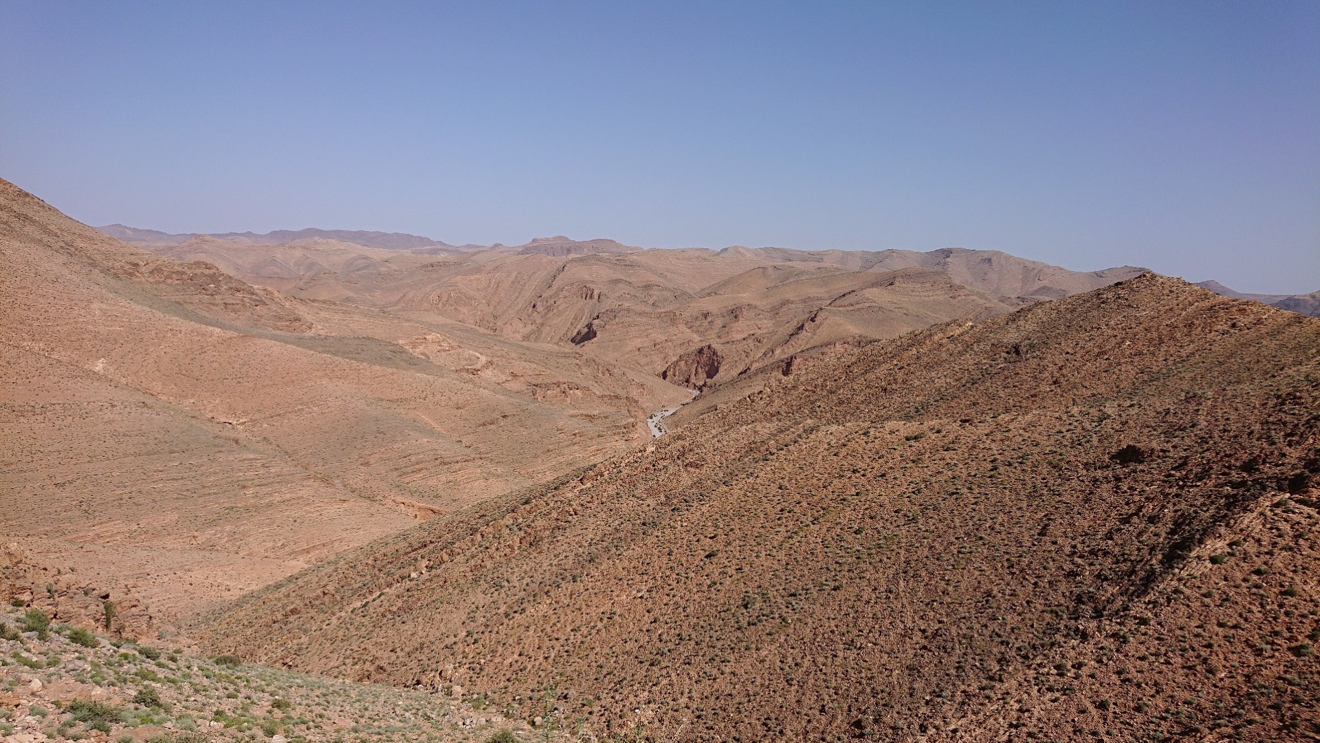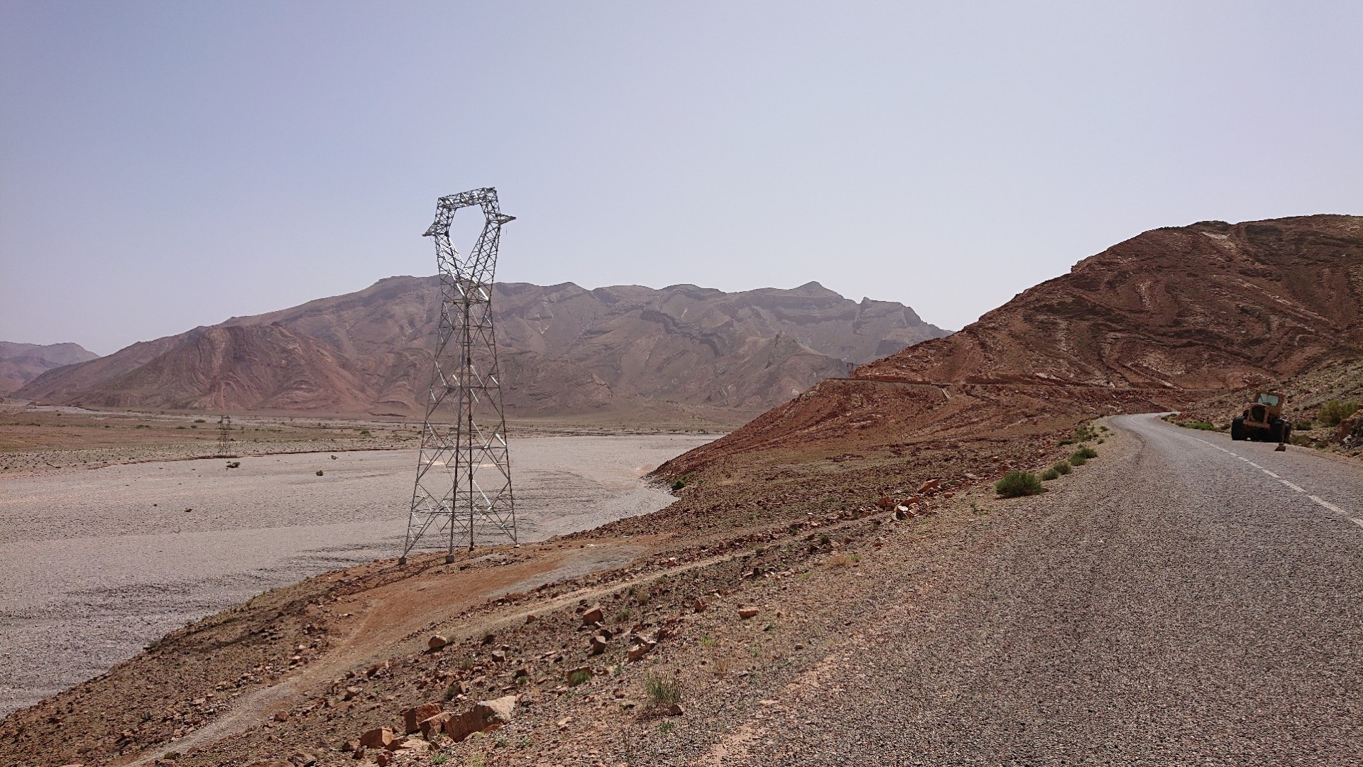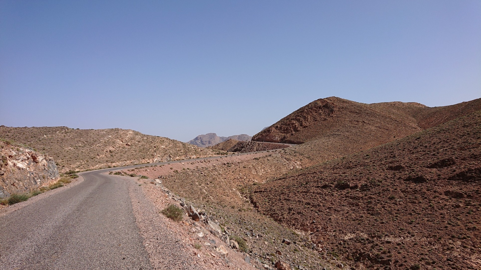 Die erste Strecke meiner heutigen Tour ging wie gesagt bis Igherm, oben auf der Karte quasi die “Spitze” der Route. Ab da dann wieder querfeldein bis runter nach Tata. Das Stück war eigentlich noch etwas netter, führte enger hier und da mal durch Schluchten und auch an einem Fluss bzw. Flussbett vorbei, das stellenweise riesig war. Wenn es mal regnet, muss es da aber so richtig zur Sache gehen. Unten auf den zwei Fotos sieht man rechts das trockene Flussbett, auf dem zweiten Foto auch eine Stelle, die offensichtlich weggeschwemmt worden ist. Solche Stellen gab es immer mal wieder, inklusive weggebrochener Straße. Ebenso aber auch immer mal wieder Stellen, die dann durch das Flussbett führen. Wenn es richtig Regen gab oder gibt, wird hier sicherlich nichts mehr gehen.