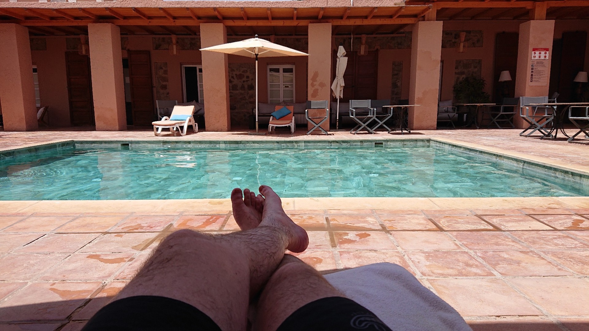 In Tata selbst war ich schon, habe mich mit etwas Brot, Wurst und Wasser eingedeckt und nochmal etwas Geld gezogen. Richtung Gebirge und Wüste soll das mit den Kartenzahlungen manchmal etwas schwieriger sein. Den restlichen Tag werde ich jetzt wohl am kleinen Pool verbringen. Dazu ein wenig marokkanischen Tee. Für alles andere ist es schlicht zu heiß – das müssten jetzt so 36 Grad sein.