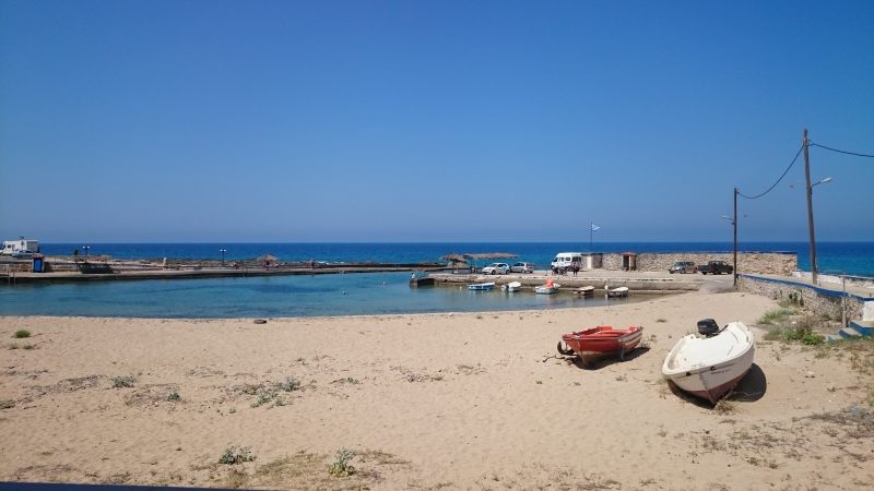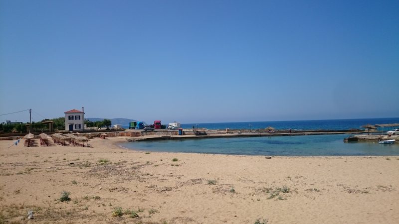 Es geht weiter nach Süden. Gerade ein Halt in einem kleinen Dorf an der Küste. Vorne im kleinen Hafen wird geschwommen, hinten auf der linken Seite läuft die Melonenernte.