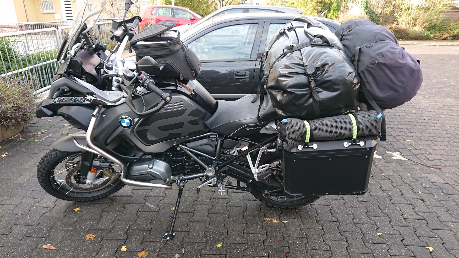 Zuvor hatte ich noch zwei Schreckmomente: Am Tag zuvor habe ich den Panzer beladen, ihn angeschmissen und bin dann mal aus der Tiefgarage gefahren. Da bekam ich eine Meldung im Display, dass die Fahrwerkseinstellung defekt sei und ich zur Werkstatt müsste. Super Gau. Die 2018er GS ADV hat da ja auch allen ESA Schnick Schnack. Und ich habe mir einfach mal überlegt: Vielleicht hat ihm gerade nicht gepasst, dass ich dahinten mal ein dickes Paket drauf geschnallt habe. Also, einfach mal Modus umgestellt und siehe da, keine Fehlermeldung mehr. Schreckmoment Nummer zwei: Reifendruck vorne und hinten deutlich runter. Jetzt bitte keine kaputten Ventile … Daher nochmal am Tag der Abholung (also gestern) eine Runde aus dem Ort gedreht und geschaut, was die Anzeige macht. Die sprang dann irgendwann hoch. Alles klar, das ist auch safe soweit.
